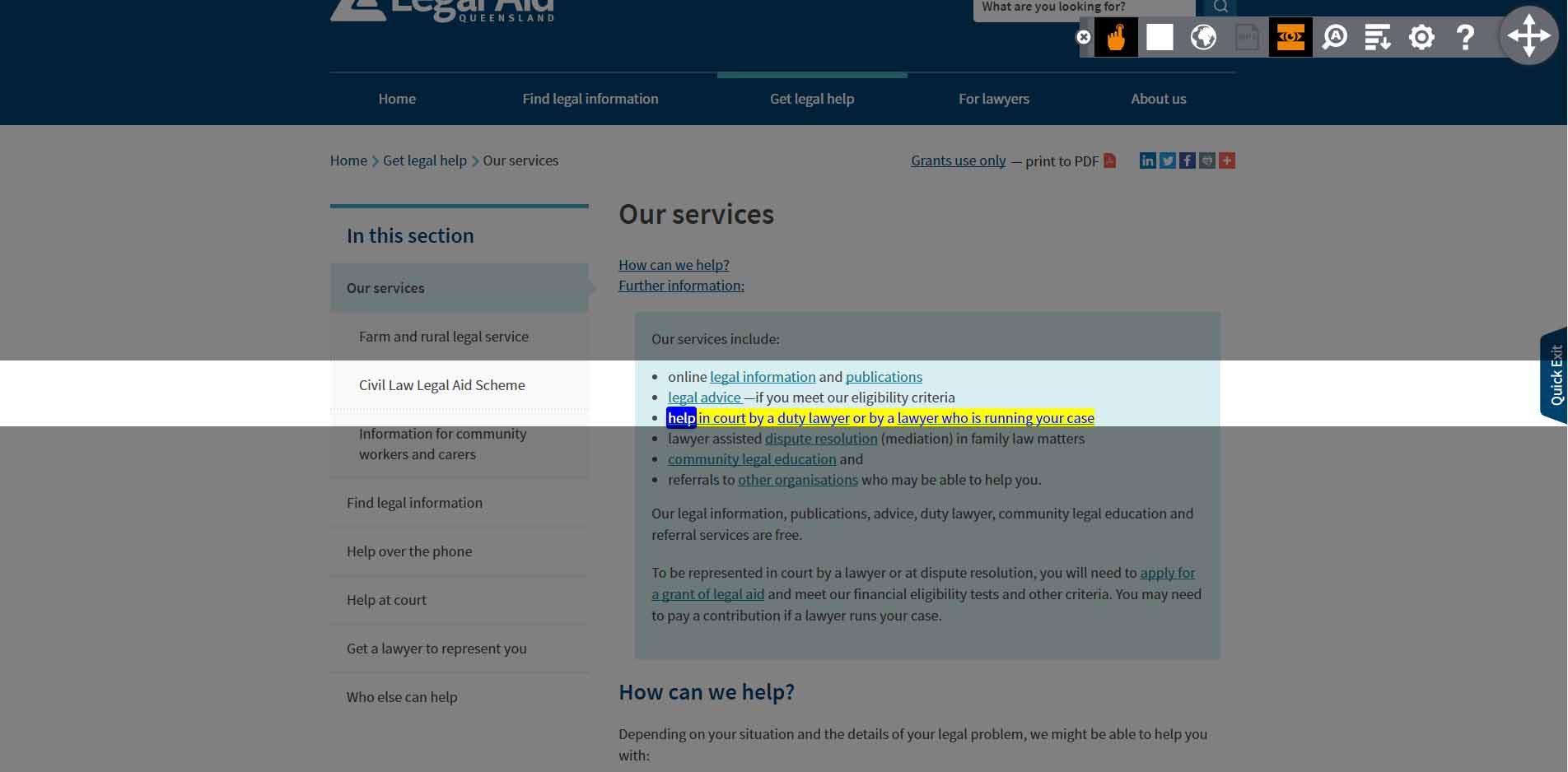 To read or translate a specific section of the page content only, highlight the relevant text and then select the play button to read. For example, in the screenshot at Figure 8 a section of the 'Our services' page has been translated into French and is ready to be read aloud by ReachDeck.